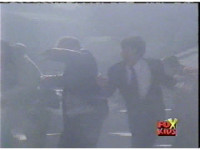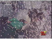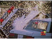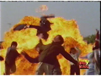 Sparks burst around a group of Japanese civilians. Then some race away while the two Silver Guardians SUVs pull up. |