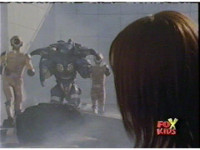 Cuts prior stuff of the Rangers trying to insert device into him, and cuts follow-up of Cyclobots with cases joining Frax. |