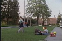 Courtyard of Angel Grove High School, guy and girl sitting on grass, as two students walk behind them. |
