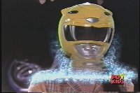 Trini looking upward as blue energy line morphs her into Yellow Ranger. |