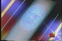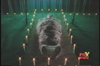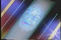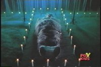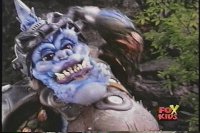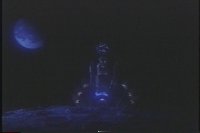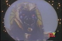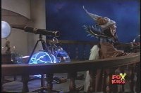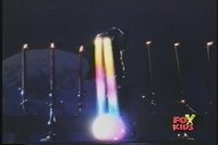 Close on altar as skullhead gets blue electricity surging into it, causing eyes to glow the full spectrum of Ranger colors. Finally it zooms out to show skullhead shooting rainbow beam from eyes into crystal ball, which glows with the colorful energy. |