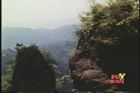 Squatt & Baboo stand atop hill near mountain, the former waving then pointing to our right, the latter pointing that way then spreading hands. |