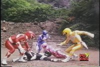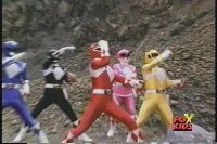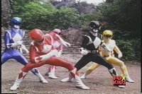 Zoom out from the five Rangers, hitting the ground and writhing in a line, as Green Ranger's feet land perfectly in front of screen. |