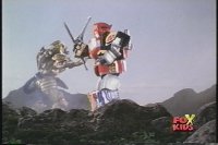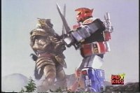Zoom out as Goldar lands on his feet, then raises sword and approaches Megazord, which soon steps into frame. |