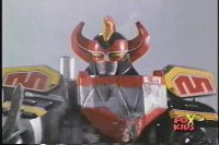 Megazord stands there as its head rocks around, sparks and smoke pouring from it, as shot zooms in. |