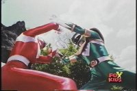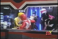 Rangers all turn around in cockpit, as Green Ranger opens back door, holds up fist, then in zoom in, punches Yellow. |