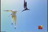 Yellow and Black Rangers fall from the sky, kicking their feet and grabbing at the air. |