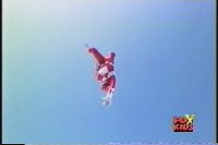 Red Ranger falls from the sky, upside down, kicking his feet and grabbing at the air. |