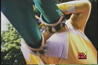 Upward angle of Yellow Ranger getting Green's feet locked around her head. |