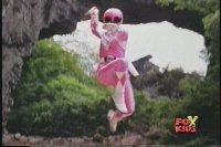 Pink Ranger leaps up and at camera with Blade Blaster in sword mode out. |