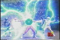 The green ball of power shoots directly from the screen into the five Power Rangers, expanding into an explosion that knocks them off their feet. |