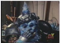 Close up of Baboo, standing just ahead of Squatt, who reacts, while the blue monkey talks, glancing to our left briefly. |