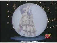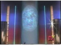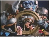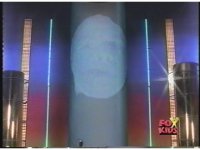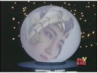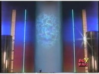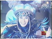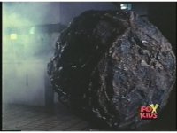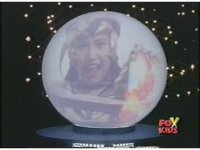 Zordon's head is vaguely visible amid blue static, talking to our left. His image flashes into view better a few times quickly. |