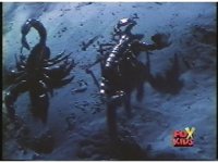 Scorpina slashes at Red Ranger, he dodges, she tries again, he blocks, they change positions, she breaks free then sparkily slashes him into a stumble off. |