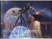 Rita, her back to us, stands at balcony railing, facing the cut-out of Earth. She thrusts both arms twice then punches with right. Does this twice, then lifts up wand and hits balcony railing. |