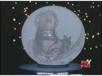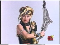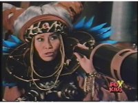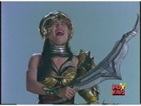 Close on Scorpina in front of blue sky-wall, holding up boomerang, then forth as she says, "Go, Putty Patrol! Attack the Power Rangers!" |