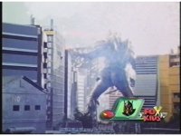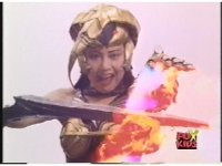 Giant Goldar walks into city and stops, zoom out as he puts left hand to eyes and releases bolts of fire energy into streets, causing sparking flash. After scene clears of smoke and sparks, he turns and blasts the buildings behind him just the same. |