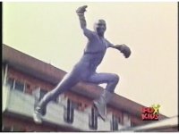 Lone Putty leaps up in front of Japanese tenement and holds out right arm as shot zooms in. |