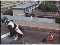 On rooftop, Pink handsprings past Putty then spins around chopping into a second one. Quick pan to second roof, where Yellow backflips between pair of Puttys, then grabs both their attacking arms and kicks each. Quick pan to third roof, Pink & Yellow visible in distance as Black ducks under Putty's kick then blocks another strike. |