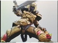 Chest-up shot of US Goldar, facing our right, slashing sword forth four times as he talks angrily. His left fist gets involved in the first one. |
