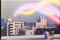 Giant Goldar walks into city and stops, zoom out as he puts left hand to eyes and releases bolts of fire energy into streets, causing sparking flash. After scene clears of smoke and sparks, he turns and blasts the buildings behind him just the same. |