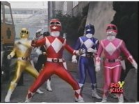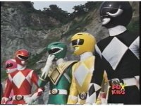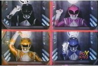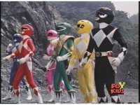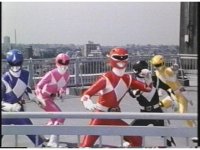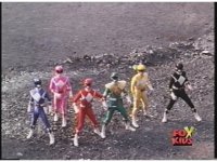 Side angle of all six Rangers looking to our upper left, Green shoots out of the line-up, then suddenly everyone looks to our upper right. |