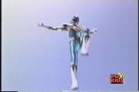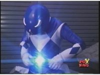 Close on Blue Ranger, crossing arms in front of face before posing down in a crouch, then another to our left. |