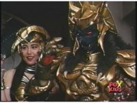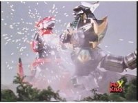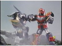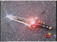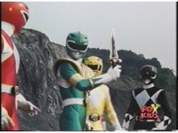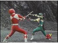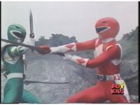 Green Ranger kicks Red Ranger as he stands, causing him to stagger a little. In return, Red thrusts sword at him, he dodges and Dagger smacks away blade. Red turns around, trying to slash again, it's blocked by Dagger, their lock is broke by Sword of Darkness smacking upward, high kick into Red's chest by Green. Another thrust by Red is blocked, sword to sword, so Green braces Dagger against Red's left shoulder, they switch positions until finally he slashes sparkily downward through Red's chest, sending him off. |