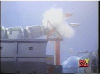 Far shot of Dragonzord standing in the unsettled waters behind the seaport, leaning back and reaching out. |