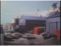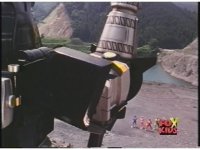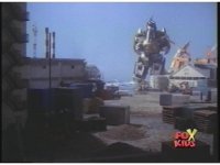 Far shot again of Dragonzord slowly lumbering toward the seaport. |