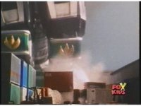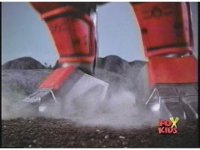Close shot of Dragonzord's foot kicking a pile of junk (trucks, cargo, barrels), out of its way, at the screen. |