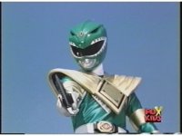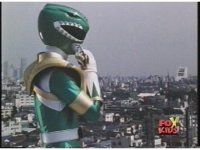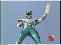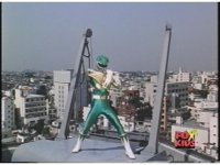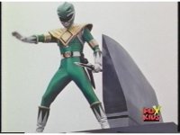 Sharp zoom out of Green Ranger holding up arms, then leaping up. |