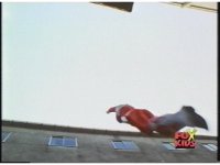 Upward shot of Red Ranger leaping up in alleyway. |