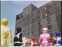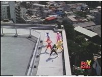 Zoom out as all five Rangers land atop roof edge, then race over to our left, hopping fence. |