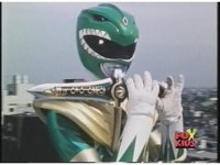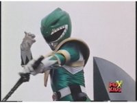 Close on Green Ranger lowering Dragon Dagger and looking to our upper left. |