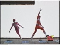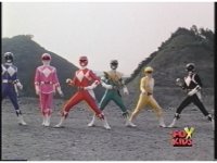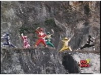 Five Rangers in alleyway, quick zoom onto Red's head as they all leap upward. |