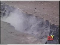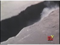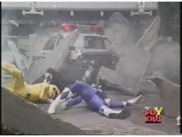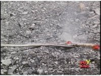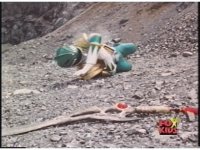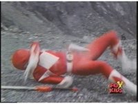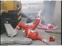 Close on Red Ranger falling smokingly to the ground in quarry. |
