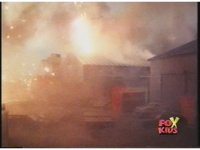 Side upward tracking shot of Dragonzord walking along, explosion bursting from warehouse it passes, smoking covering it as another explodes offscreen near it. |