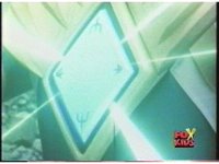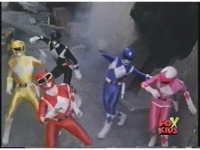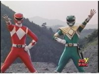 Red Ranger fires Blade Blaster at approaching Green Ranger, but green energy diamond shield reflects pair of red beams right back at Red, causing a pair of bursts. Red staggers back, then moves to a new position and fires again, only to have those blasts reflected right back into him, causing him to fall back. |