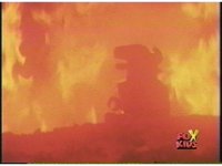 Upward angle of Dragonzord walking along, a fireball bursting up to our left, then another to our right. |