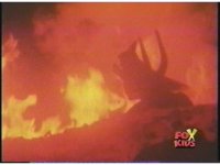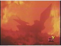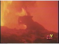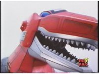 Close on Dragonzord's sideways head, roaring as its eyes flash red. |
