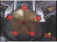 Extreme close up of Dragonzord's golden chest plate, all six red lights surging to life as red and yellow energy surges through them. |