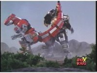 Zoom out as Dragonzord in Fighting Mode stands completed, as Tyrannosaurus Dinozord is off to the left fidgeting. |