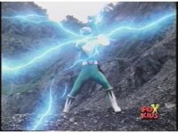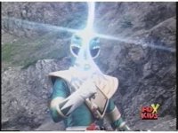 Quick zoom out as Green Ranger poses on quarry hill, crossing Sword of Darkness with Dragon Dagger causing bluish electricity to crackle about, screen flashes white. |