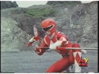Red Ranger falls and rolls, but gets up to crouching position, shifts around sword and reaches for holster. |