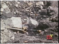 Sword of Darkness falls, smoking, onto quarry ground. |