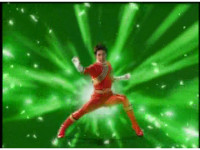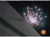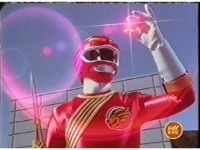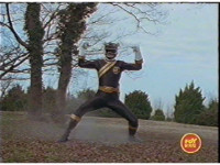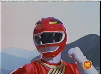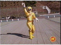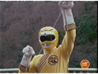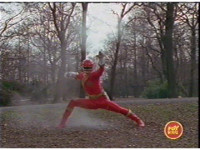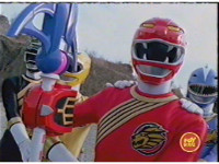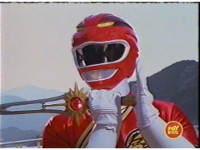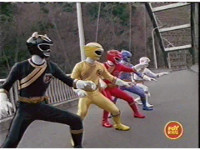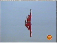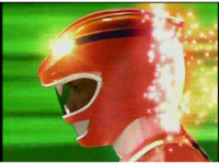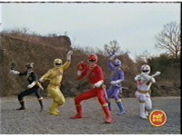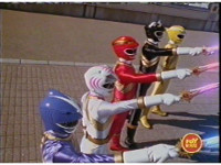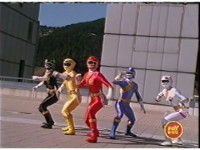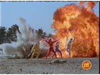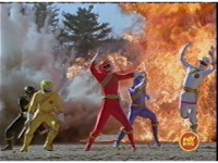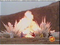 Plug Org spark bursts, the Rangers jump about face and pose as he explodes massively. |