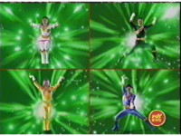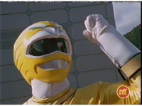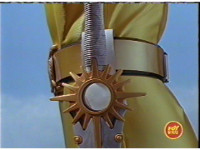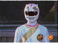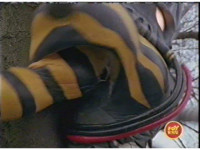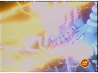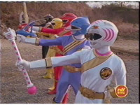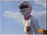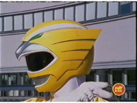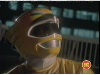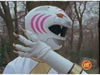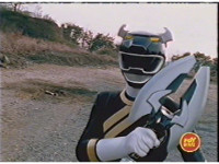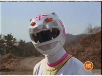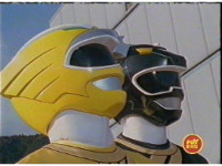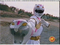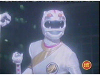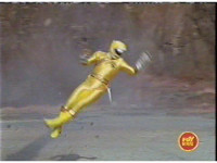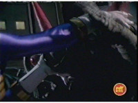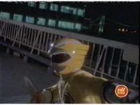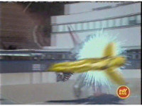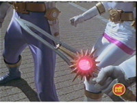 Turbine Org falls onto a roof, gets up, Yellow then Crystal Saber strikes him sparkily, but he sparkily strikes back at the same time, knocking her down, where the Org is about to bash her, when White's Tiger Baton blocks his arm, she then kicks him back. |