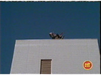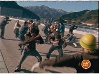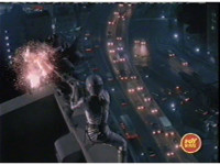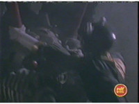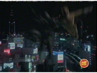 Pan up to Turbine Org, atop a structure, talking, before he activates his turbines and begins to blow air at a crowd of Japanese civilians. |
