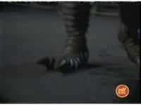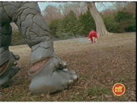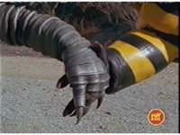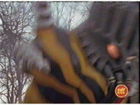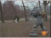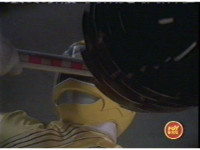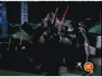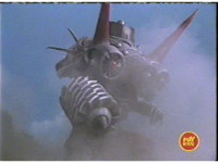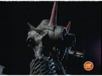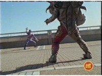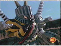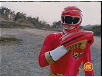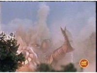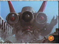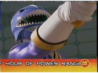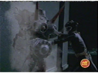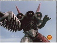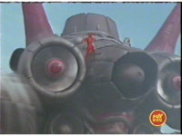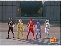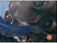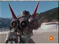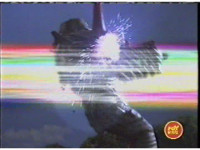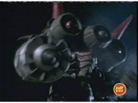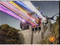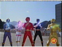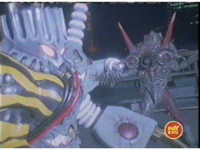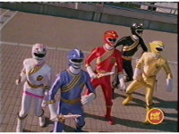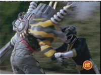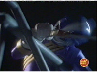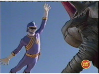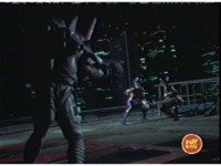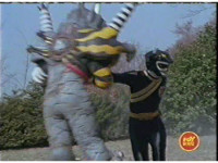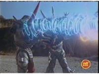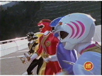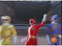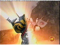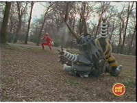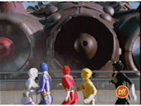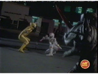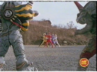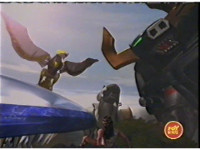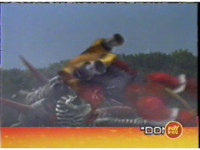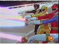 Final shot is textless, unlike source; Cuts follow-up helmet shot, then the three Rangers scratch the ground, before attacking Plug Org at once, he then sparkily blasts them off. |